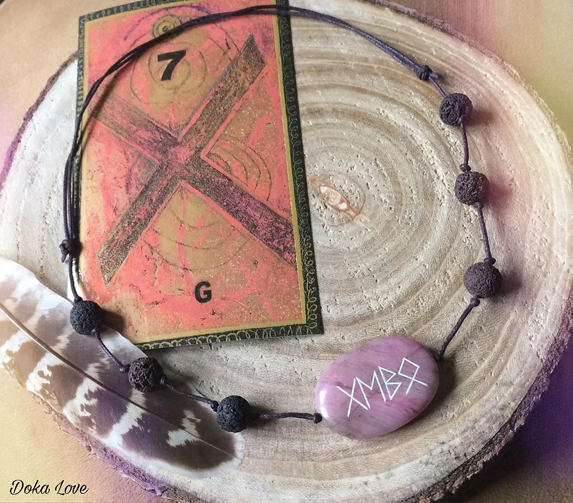 Talizman w postaci naszyjnika skomponowanego z owalu rodonitu, na którym wygrawerowałam ręcznie nazwę runy Gebo pismem runicznym i pomalowałam ją na biały kolor. Dodatkową ozdobą, dodającą charakteru naszyjnikowi są kuleczki brązowej lawy wulkanicznej. Bazę naszyjnika stanowi ciemnobrązowy sznureczek. Obwód naszyjnika jest regulowany.