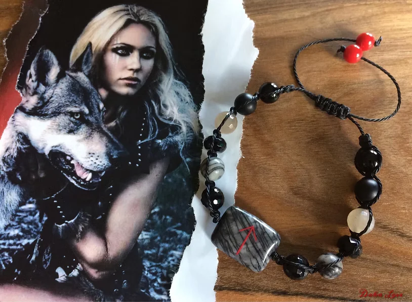 Centralny element talizmanu stanowi prostokątny jaspis Picasso o wymiarach 20 x 15 x 5 mm, z ręcznie wygrawerowaną i pomalowaną na czerwony kolor runą Tiwaz.