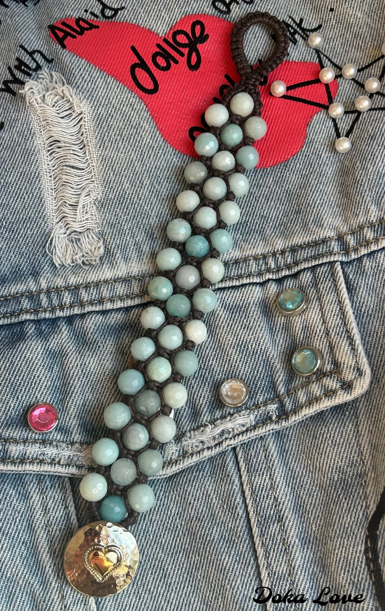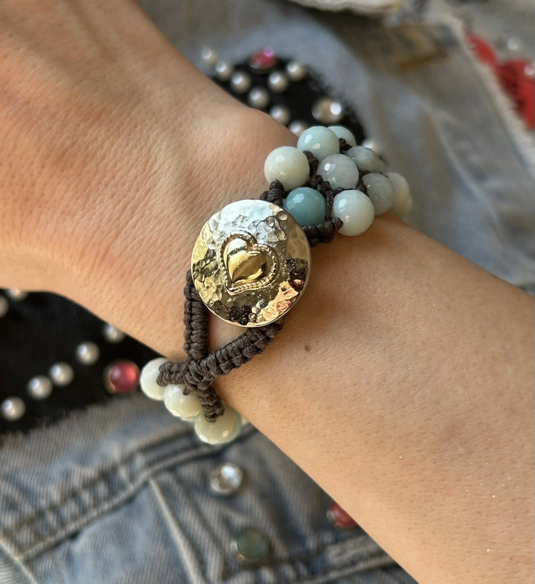 Bransoletka makramowa wykonana z fasetowanych kuleczek amazonitu o średnicy 8 mm, zaplatana na ciemnobrązowym sznureczku, zapinana na srebrno-złoty metalowy guziczek z motywem serca.