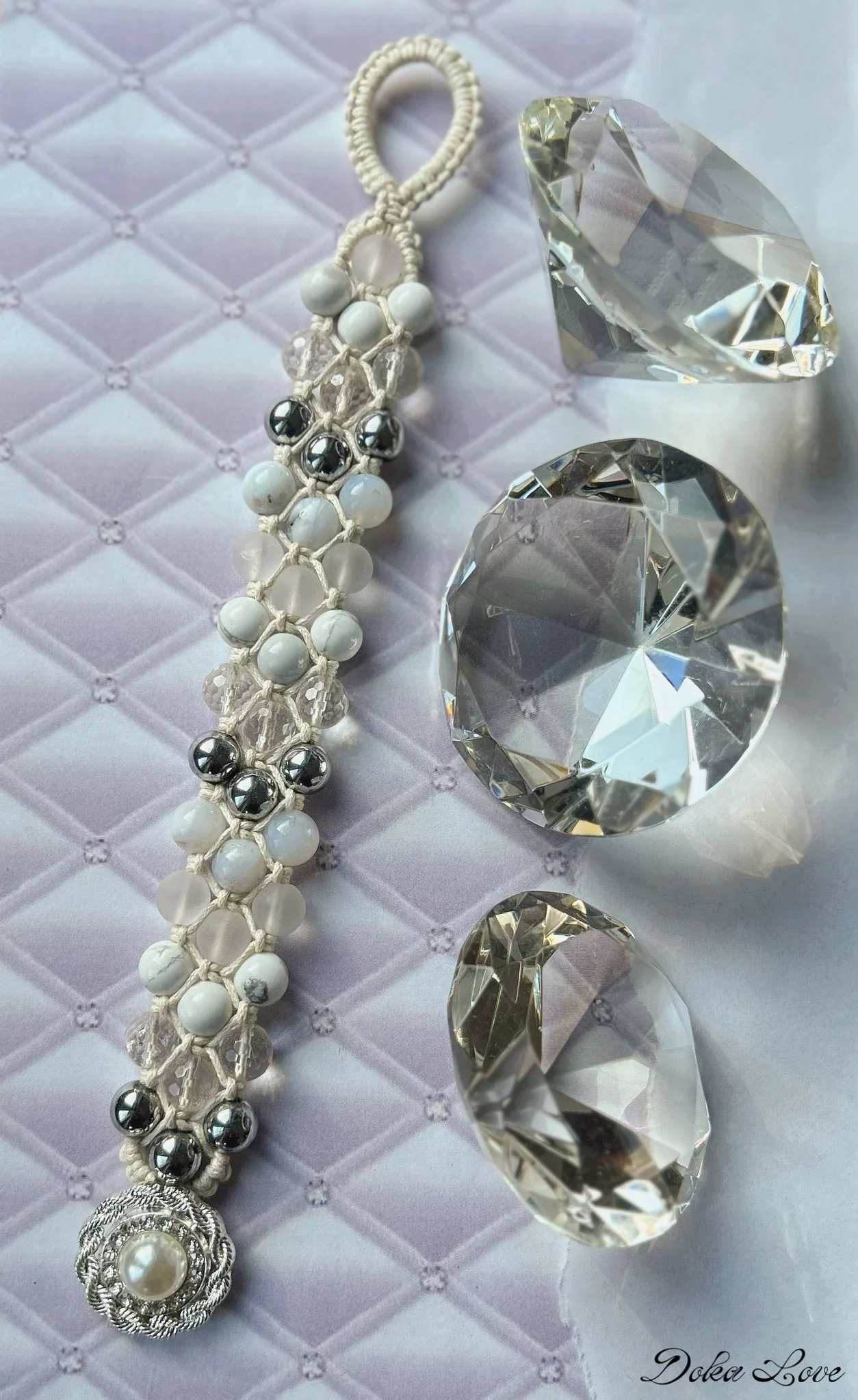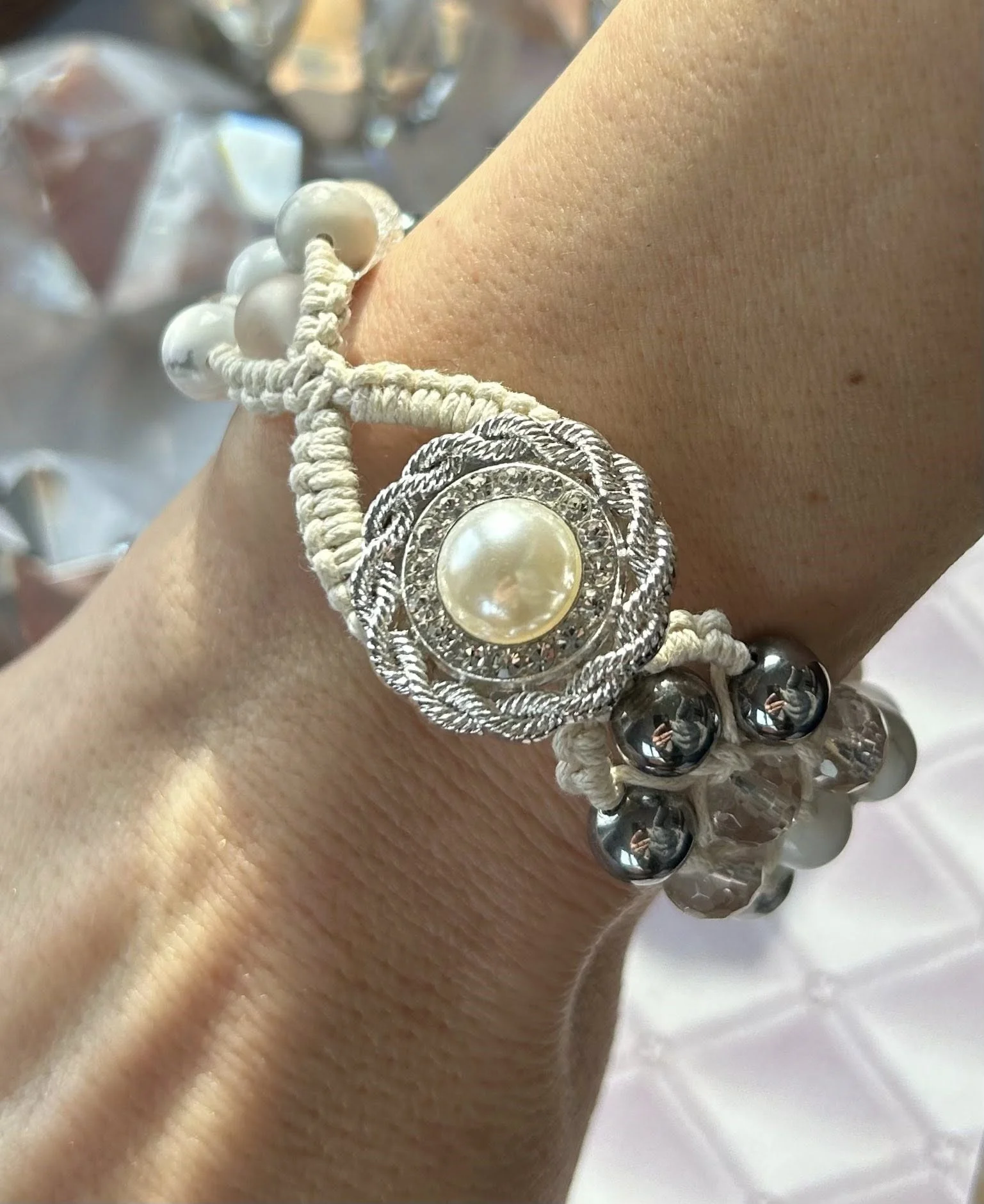 Trzyrzędowa makramowa bransoletka skomponowana z gładkich kuleczek hematytu srebrnego, howlitu i opalu pospolitego oraz kuleczek kryształu górskiego w wersji matowej i błyszczącej – fasetowanej. Kamienie mają średnicę 8 mm.