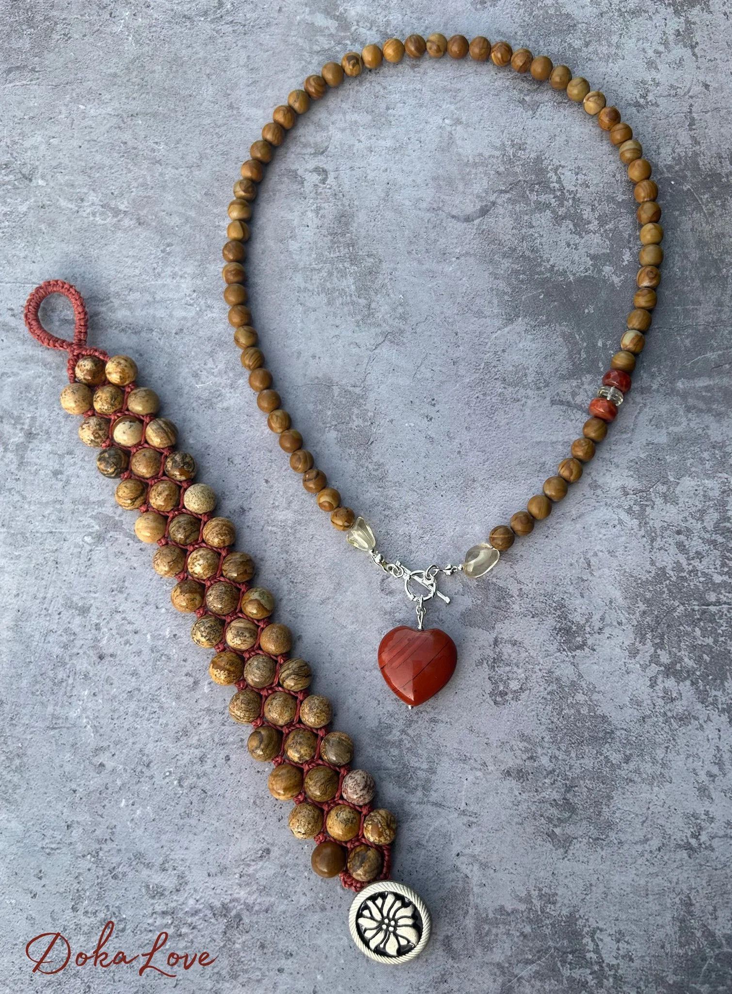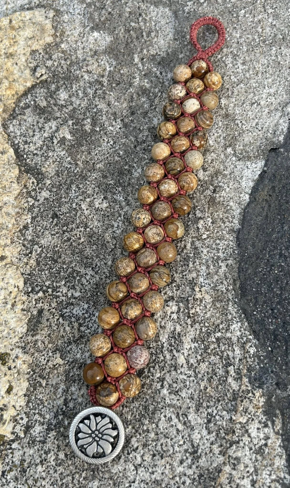 Trzyrzędowa makramowa bransoletka skomponowana z kuleczek jaspisu krajobrazowego o średnicy 8mm. Kamienie zaplotłam w trzech rzędach, splotem makramowym, na rdzawoczerwonym sznureczku, którego kolor koresponduje z kolorem czerwonego jaspisu.