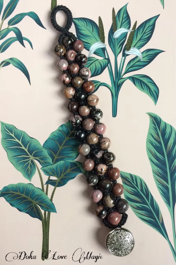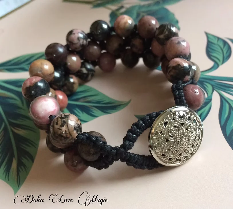 Bransoletka makramowa wykonana z kulek jaspisu rodonitu o średnicy 10 mm, z ozdobnym metalowym guziczkiem w kolorze srebrnym. Obwód wewnętrzny: 16,8 cm